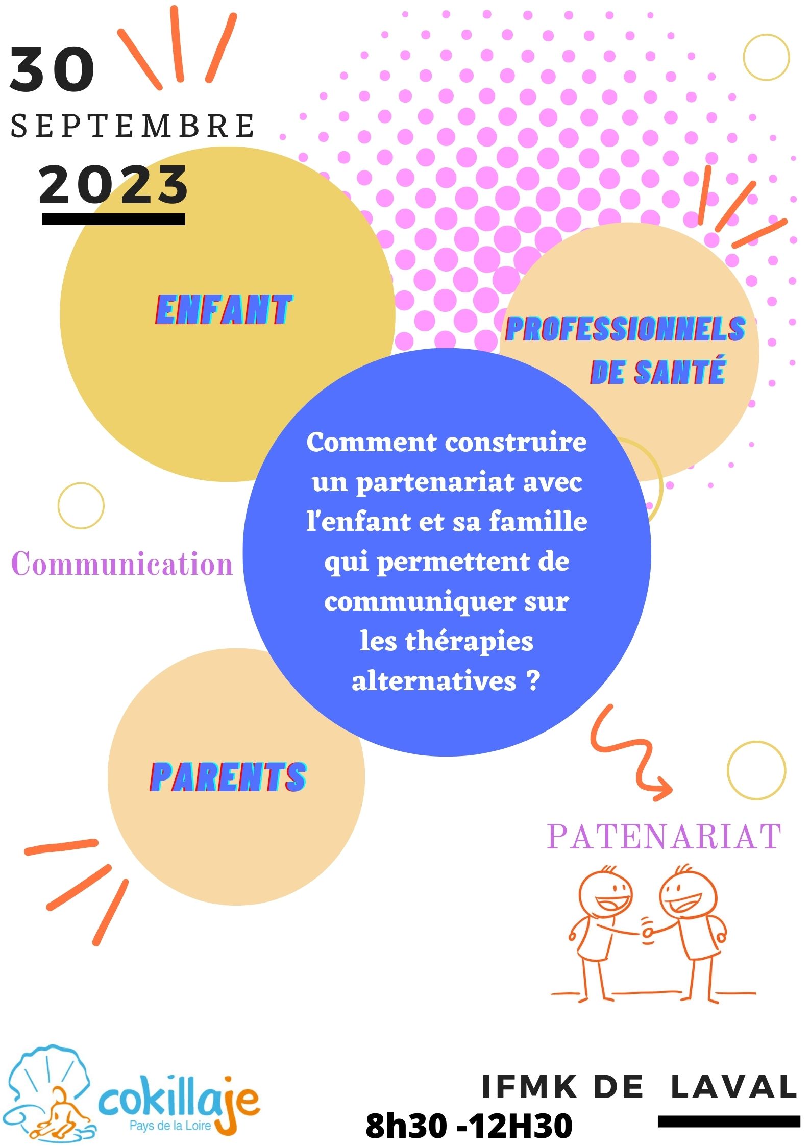 - Samedi 30 Septembre 2023 IFMK LAVAL 8H30 – 12H30 – « Comment construire un partenariat avec l’enfant et sa famille qui permet de communiquer sur les thérapies alternatives ? ».